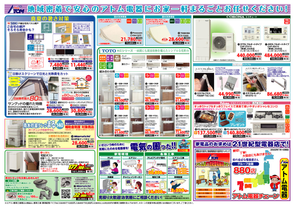 アトム電器 8月号 お買い得商品! アトム電器情報 2022.08.11 https://www.atom-denki.co.jp/best-deals/catalogs/ エアコンセールは8月31日まで開催しております。