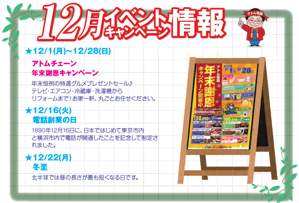 アトムチェーンでは今年一年の皆様からのご愛顧に感謝いたしまして12月28日まで“年末謝恩キャンペーン・特選グルメプレゼントセール”を開催しております。