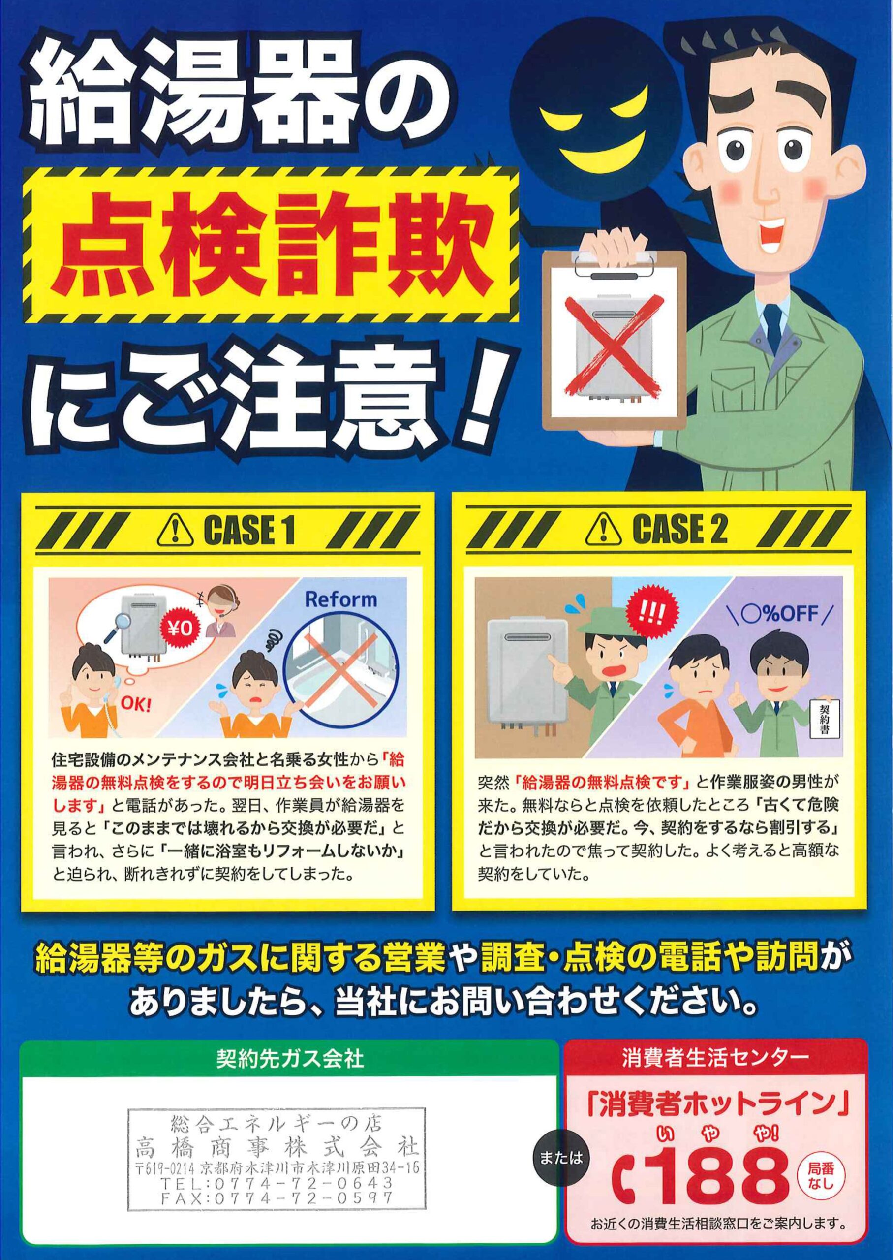 電話や訪問で突然給湯器の点検を持ち掛け、不安をあおって高額な給湯器の交換を迫る手口が多くみられます。中には、電話口で「自治体から委託を受けた」「契約中のガス会社から依頼された」などと身分を偽るケースもみられます。
